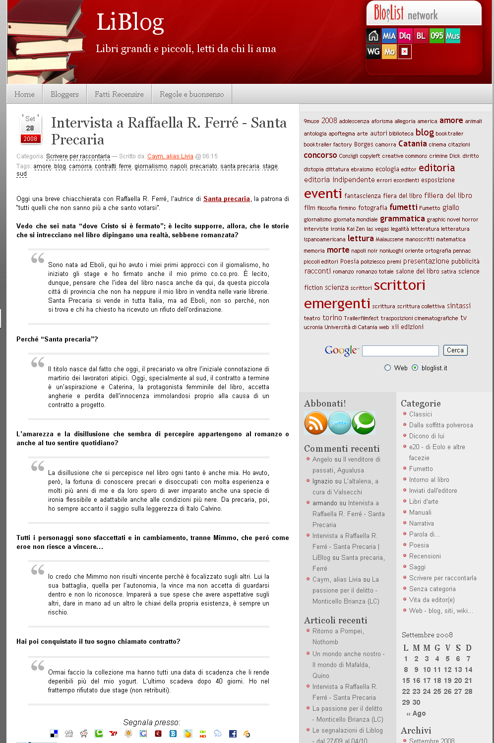 La rassegna stampa dei Fuochi è completa al 99,9% così come quella di Santa Precaria. La verità è che ho tentato di raccogliere recensioni, articoli e video che riguardano tutti i libri: per loro due ci sono riuscita, per il resto decisamente no.